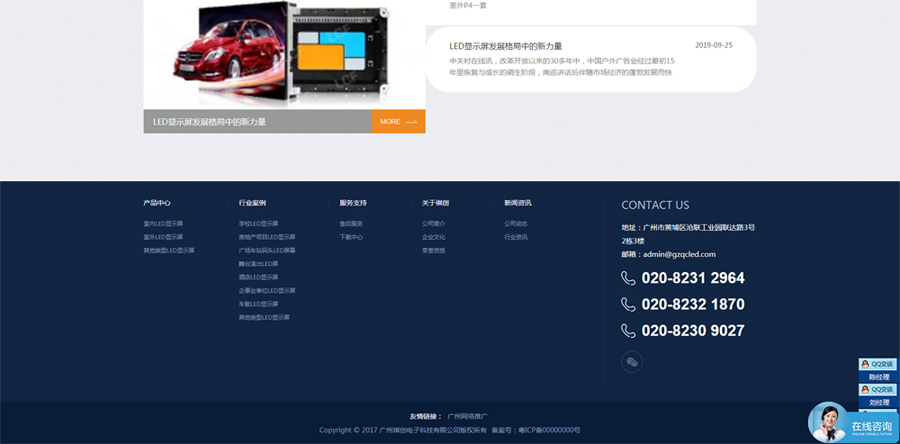 廣州祺創(chuàng)電子科技有限公司(以下稱祺創(chuàng)科技)于2005年成立于廣東廣州,專注于LED顯示屏行業(yè),是廣州地區(qū)最具規(guī)模和最專業(yè)的LED屏幕生產(chǎn)廠家之一,公司集研發(fā)、生產(chǎn)、營(yíng)銷、施工安裝和售后服務(wù)為一體,產(chǎn)品包括:室內(nèi)外LED電子顯示屏、LED全彩顯示屏、小間距屏幕,以及其它LED電子顯示屏配件,主打全彩LED電子屏以及為客戶提供其它個(gè)性化LED屏設(shè)計(jì)和服務(wù)。