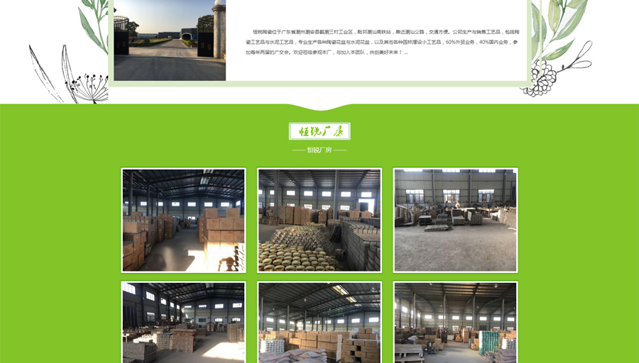 恒銳陶瓷位于廣東省潮州潮安縣鸛潮三村工業(yè)區(qū),毗鄰潮汕高鐵站,靠近潮汕公路,交通方便。公司生產(chǎn)與銷售工藝品,包括陶瓷工藝品與水泥工藝品,專業(yè)生產(chǎn)各種陶瓷花盆與水泥花盆,以及其他各種園林?jǐn)[設(shè)小工藝品,60%外貿(mào)業(yè)務(wù),40%國(guó)內(nèi)業(yè)務(wù),參加每年兩屆的廣交會(huì)。歡迎蒞臨參觀本廠,與加入本團(tuán)隊(duì),共創(chuàng)美好未來(lái)